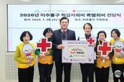 한국시사경제 윤광희 기자 | 인천 미추홀구는 28일 구청장실에서 대한적십자사 인천지사(회장 조의영)와 적십자봉사회 미추홀구협의회(회장 조혜정) 등이 참석한 가운데 적십자 특별회비 200만 원을 전달했다. 이날 전달된 특별회비를 포함한 적십자회비는 재난 발생 시 이재민 구호 활동, 취약계층 및 복지 사각지대 위기가정 지원 등 각종 인도주의 활동에 사용될 예정이다. 이영훈 구청장은 “지역 곳곳의 소외된 이웃에게 희망을 전하는 의미 있는 일에 동참할 수 있어서 기쁘다.”라며, “지역사회에 따뜻한 기부 문화가 널리 퍼질 수 있도록 함께 노력하겠다.”라고 말했다. 한편, 구는 매년 지역사회 소외계층을 돕기 위해 적십자 특별회비 납부에 동참하고 있으며 이를 통해 지역 내 어려운 이웃들에게 실질적인 도움을 주고 있다.