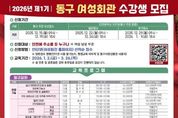 한국시사경제 윤광희 기자 | 인천 동구는 2026년 1월9일까지 ‘2026년 제1기 동구 여성회관 수강생’을 모집한다고 밝혔다. 2026년 1월2일부터 3개월 과정으로 진행되는 제1기 정규강좌 프로그램은 수강생들로부터 자격증 취득과 취업을 이끌어내 호평을 받은 실내인테리어(도배 및 필름) 등의 자격증 취득 프로그램과 어반스케치, 민화 그리기를 포함한 요리·공예 프로그램 등 총 26개 과정으로 운영된다. 특히 2025년 많은 수강생이 커피 바리스타 2급을 취득한 기존 커피 바리스타 강좌에 신규로 야간 강좌까지 추가되어 카페 취업이나 창업에 도움이 될 수 있도록 했다. 또한 한식 디저트 만들기 강좌와 장 담그기, 전통 헤어 강좌는 실생활 활용도가 높은 프로그램으로, 1개월 단기 특강으로 운영해 주민들이 부담 없이 참여할 수 있도록 구성했다. 일일 무료 특강으로는 일일민화그리기 특강과 커피 원데이 클래스가 준비됐다. 수강 신청은 인천 거주자를 대상(동구 주민 우선)으로 여성회관 홈페이지를 통해 선착순 접수하며, 온라인 접수에 불편을 겪는 분이나 동구사랑상품권·평생교육 바우처 사용자는 여성회관