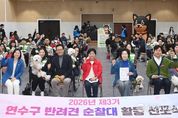 한국시사경제 윤광희 기자 | 연수구는 지난 21일 구청 대회의실에서 반려견순찰대 ‘연수지킴댕댕이’ 활동 선포식을 열고 3기 순찰대원을 공식 위촉했다. 2024년 연수구는 인천 기초자치단체 최초로 직영 반려견순찰대 운영을 시작했으며, 올해 3기를 추가로 모집해 서류 및 현장 심사를 거쳐 총 87팀을 위촉했다. 이날 행사는 위촉장 수여식 후, 민재연 수의사의 ‘안전한 순찰과 건강한 일상생활을 위한 반려견 운동 가이드’ 강좌와 반려견순찰대 기본 사항 및 순찰 방법에 대한 교육이 진행됐다. ‘연수지킴댕댕이’는 반려견과 함께하는 일상적인 산책을 통해 우리 동네 구석구석을 살피며 생활 불편 사항을 점검하고 펫티켓을 홍보한다. 순찰대는 야간 시간대 범죄취약지역을 중심으로 합동 순찰을 하고, 관내 공원에서 ‘펫티켓 홍보 캠페인’ 등을 추진할 계획이며, 구는 연말 순찰대 활동 사례 발표를 통해 우수 순찰대원을 표창할 예정이다. 반려견순찰대는 지난해 4월부터 9개월간 총 5,640회 순찰했으며, ▲112 신고 13건, ▲안전신문고 신고 130건 등 총 143건의 신고를 접수했다. 이재호 구청