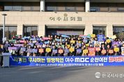 한국시사경제 전남취재본부 | 여수MBC 순천이전을 저지하기 위한 여수시민들의 외침이 도심 한가운데 울려 퍼졌다. 15일 여수시에 따르면, 이날 오후 3시 여수시와 여수시의회, 시민사회단체로 구성된 ‘여수MBC 순천이전 반대 범시민대책위원회’는 시의회 청사 1층 공감뜨락에서 ‘여수MBC 지키기! 대시민 토론회 및 결의대회’를 가졌다. 이날 대회는 범대위 공동위원장인 여수시장과 시의장, 범대위 회원을 비롯해 시민과 시의원 등 3백여 명이 참석한 가운데, 1부 대시민토론회와 2부 결의대회 순으로 진행됐다. 이들은 결의문에서 “시민 의견을 배제하고 공론화 과정 없이 일방적으로 추진한 여수MBC 순천이전을 즉각 중단하라”며, “이전 계획을 철회하고 공영방송의 책무를 다하라”고 촉구했다. 정기명 시장도 “여수MBC는 지금이라도 시민들께 사죄하고 대화에 나서라”며, “대화를 통해 시민적 합의만 이뤄진다면 시는 어떠한 제안도 수용할 준비가 되어있는 만큼 이 위기를 함께 헤쳐 나가자”고 밝혔다. 한편, 참석자들은 행사를 통해 결의를 다지고, 여수시의회를 출발해 KB국민은행과 (구)송원백화점, 해양경찰서