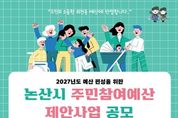 한국시사경제 김태훈 기자 | 논산시는 오는 5월 15일까지 ‘2027년도 예산편성을 위한 주민참여예산 제안사업 공모’를 진행한다. 공모에 참여하고자 하는 시민은 제안신청서를 작성해 논산시청 누리집과 우편으로 제출하거나 논산시청 예산실, 읍·면사무소 및 동 행정복지센터를 방문해 접수하면 된다. 제안된 사업은 관련 부서 검토와 시민 투표, 주민참여예산위원회 심의를 거쳐 2027년도 예산편성에 반영될 예정이다. 시는 선정된 사업이 투명하고 실효성 있게 추진될 수 있도록 지속적인 모니터링도 병행한다. 시 관계자는“시민이 제안한 아이디어가 실제 정책으로 실현되는 논산을 만드는 큰 힘이 될 것”이라며 “지역의 미래를 함께 만들어간다는 마음으로 많은 관심과 제안을 부탁드린다”고 말했다. 한편, 논산시는 예산편성 과정에 대한 시민의 이해도를 높이고, 공모 참여를 돕기 위해 지난 3월 15개 읍면동을 순회하며 ‘주민참여예산학교’를 운영했다. 지난해에는‘2026년도 주민참여예산사업 공모’를 통해 ▲학교 앞 도로 LED 로고라이트 설치 ▲ChatGPT 교육 ▲맨발걷기길 조성 등 총 206건, 약 27억