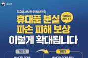 한국시사경제 문화팀 | 학교에서 보관·관리하던 중 휴대품 분실·파손 피해 보상 이렇게 확대됩니다. (시행일자 2026.4.1.) ■ 개정 전 보상대상 휴대품: 3종 - 휴대폰, 태블릿PC, 노트북 - 보상한도 100만 원 ■ 개정 후 보상대상 휴대품 확대: 3종 → 5종 - 휴대폰, 태블릿PC, 노트북 (신규) 무선이어폰, 스마트워치 - 보상한도 확대 100만 원 → 200만 원